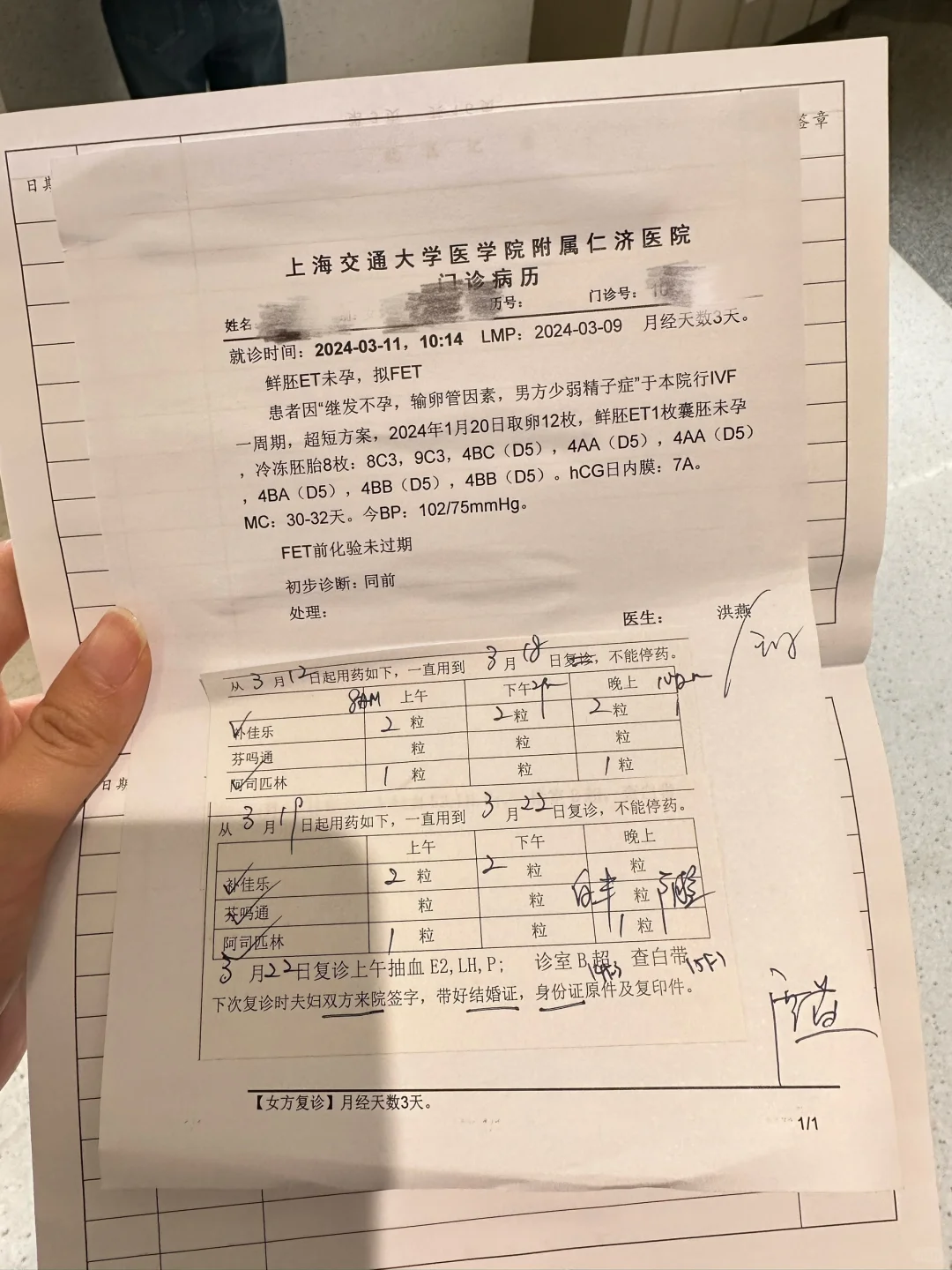 第一次移植失败了,第二次月经第三天找洪医生已经有冻胚不需要打针促排了开了一些药吃吃就行了我问医生:这次失败是什么原因啊?🧑⚕️:这正常的,本来就不是一次就会成功的我问:我移植第四天走了1万多步,是不是因为这个没成功啊?🧑⚕️:不是的,正常生活就行我问:那下次可以放两个胚胎增加成功几率吗?🧑⚕️...