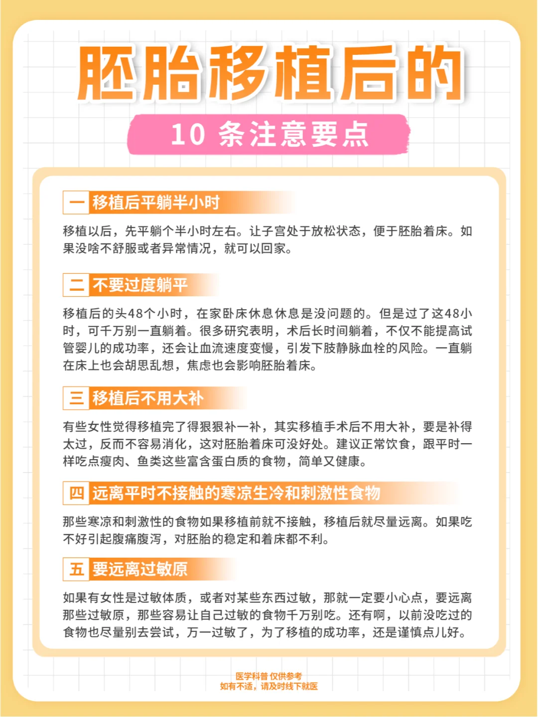 # 试管婴儿移植后,超全的注意事项📋👶🏻试管移植后怎么护理?这篇超详细攻略快码住!✨一、移植后平躺半小时 移植完先安心平躺半小时哦,让子宫好好放松,助力胚胎顺利着床。要是没有不舒服或异常,就可以回家啦。💤二、不要过度躺平 前 48 小时在家卧床休息尚可,但过了这时间千万别一直躺着不动啦!研究表明,术...