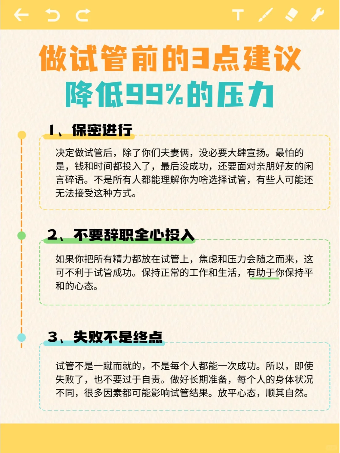 准备踏上试管的姐妹们,听我说,如果你能遵循我这三点建议,你的压力至少能减少99%。这些可能不是所有医生都会告诉你的,但今天我就来主动分享给你们。1、保密进行决定做试管后,除了你们夫妻俩,没必要大肆宣扬。最怕的是,钱和时间都投入了,最后没成功,还要面对亲朋好友的闲言碎语。不是所有人都能理解你为啥选择试...